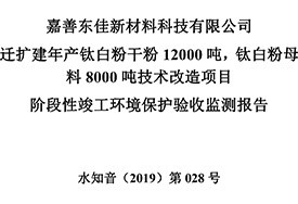 公?? 示??? 根據(jù)《國務(wù)院關(guān)于修改〈建設(shè)項(xiàng)目竣工環(huán)境保護(hù)管理?xiàng)l例〉的決定》(國務(wù)院令第682號(hào)),以及環(huán)保部《關(guān)于發(fā)布的公告》(國環(huán)規(guī)環(huán)評(píng)[2017]4號(hào)),現(xiàn)將嘉善東佳新材料科技有限公司遷擴(kuò)建年產(chǎn)鈦白粉干粉12000噸,鈦白粉母料8000噸技術(shù)改造項(xiàng)目階段性竣工環(huán)境保護(hù)